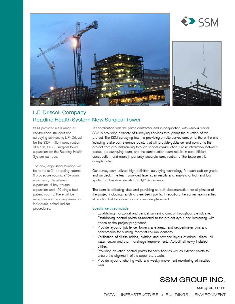 SSM provided a full range of construction stakeout and surveying services to L.F. Driscoll for the $354 million construction of a 476,000 SF surgical tower expansion on the Reading Health System campus.